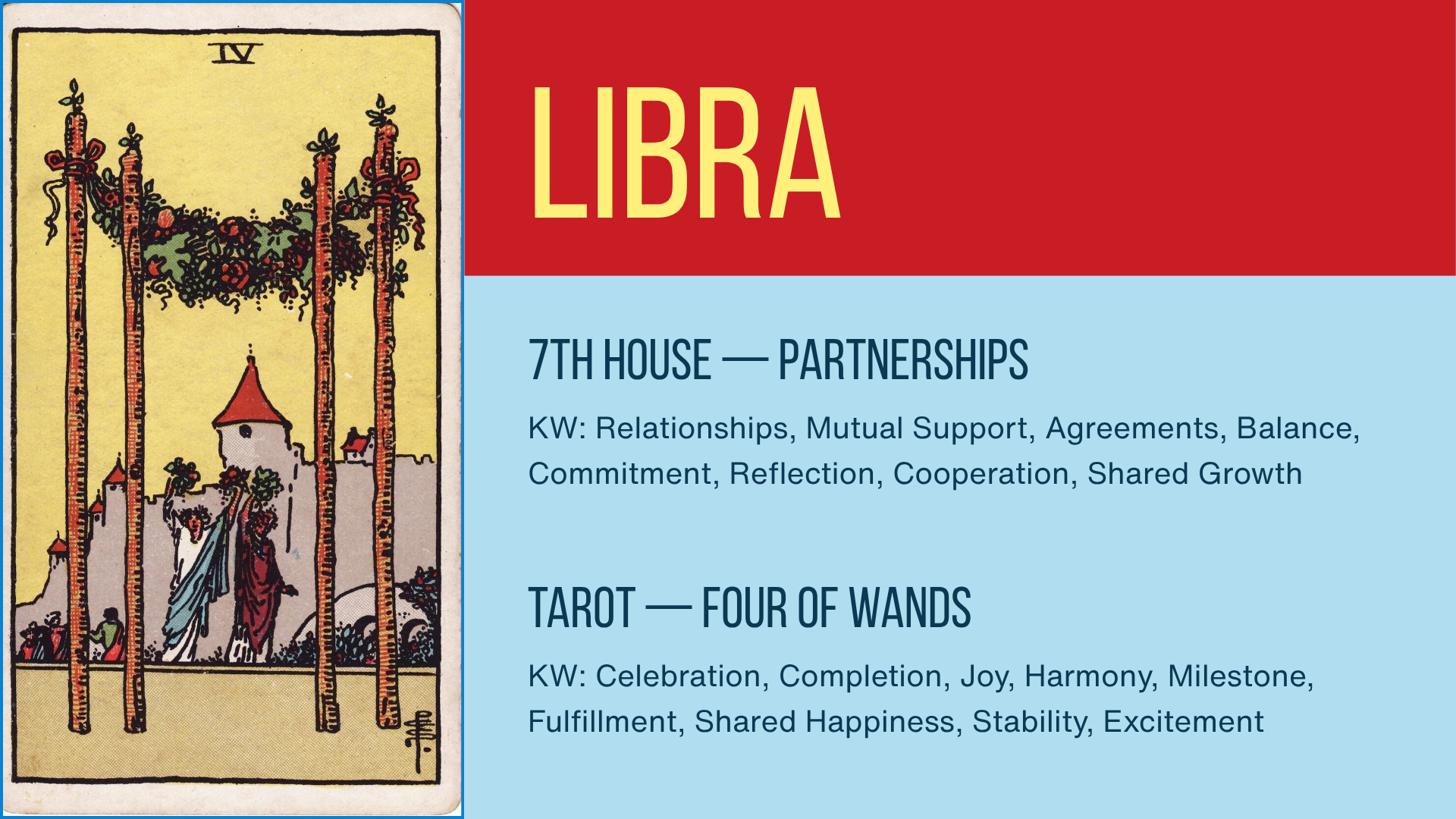The Four of Wands reflects celebration and the joy of reaching a meaningful milestone. There is a sense of completion that opens into new beginnings, creating space for shared happiness and recognition. Stability and excitement coexist, allowing accomplishment to be fully felt. It can carry the feeling of thanksgiving, where something important has come together and is ready to be enjoyed.