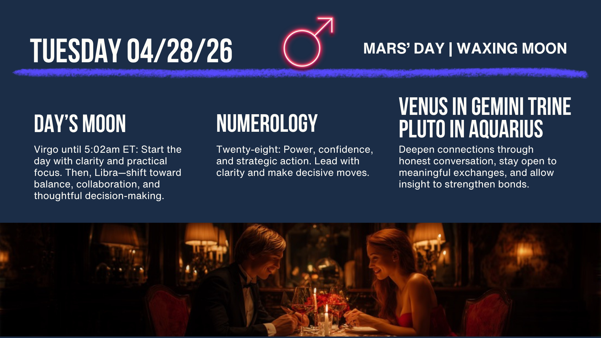 On Tuesday, The Moon is in Virgo until 5:02am ET before entering Libra, shifting the tone toward balance, relationships, and decision-making. Venus in Gemini trines Pluto in Aquarius, supporting deeper conversations and meaningful connections. A 28 day brings confidence and strategic awareness, helping you move forward with clarity in relational dynamics. Today’s best use: engage honestly, strengthen connections, and move forward with intention.