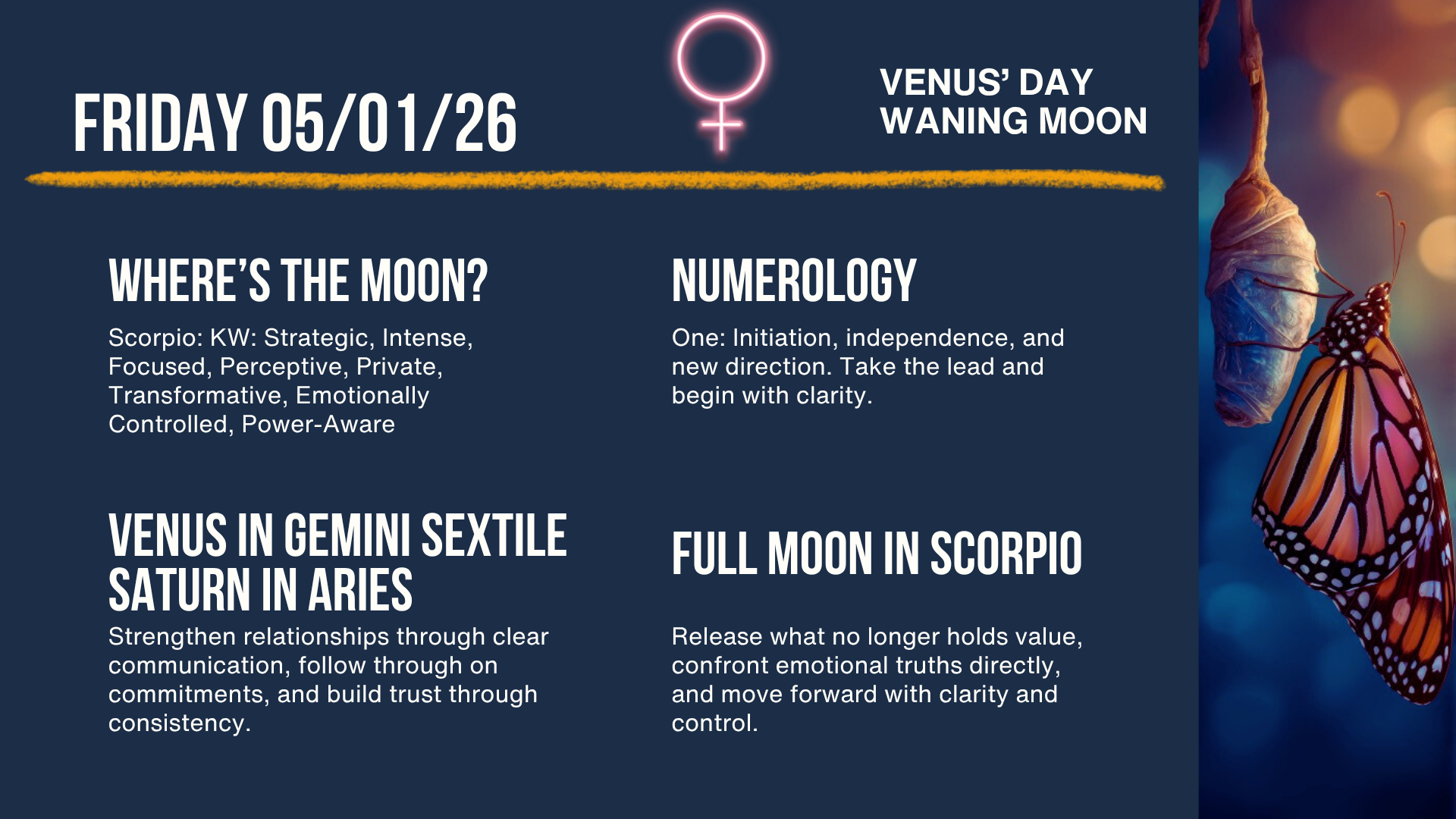 The Moon remains in Scorpio all day Friday, intensifying focus, emotional depth, and awareness. The Full Moon in Scorpio brings culmination and release, highlighting what has reached its peak and what needs to be let go. Venus in Gemini sextiles Saturn in Aries supports steady, grounded connection, helping to stabilize what remains. A 1 day emphasizes new direction and forward movement. Today’s best use: release what’s complete, strengthen what matters, and move forward with clarity.