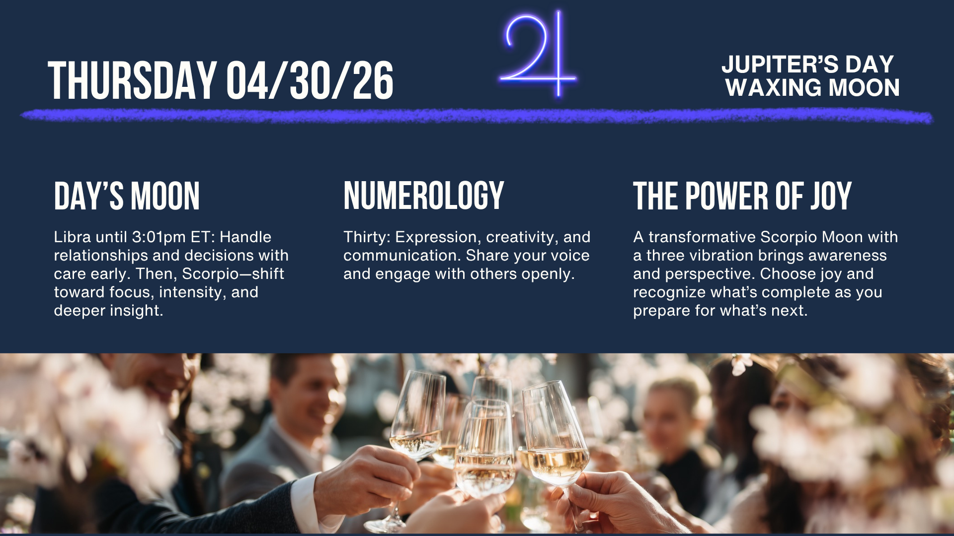 On Thursday, The Moon is in Libra until 3:01pm ET before entering Scorpio, shifting from balance into focus and intensity. A 30 day brings a celebratory, joyful vibration that supports expression, connection, and shared moments, even as the energy deepens later on. Today’s best use: enjoy connection and express yourself early, then commit to what requires focus and depth.