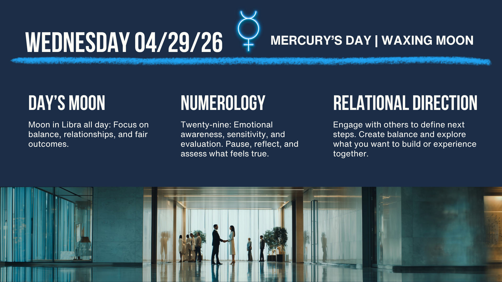 The Moon remains in Libra all day Wednesday, emphasizing relationships, fairness, and collaboration. The energy supports partnership and evaluating where balance is needed, especially with a 29 day that heightens emotional awareness and reflection. This is a day to define next steps and consider what you want to build with others. Today’s best use: communicate clearly, seek balance, and align on shared direction.