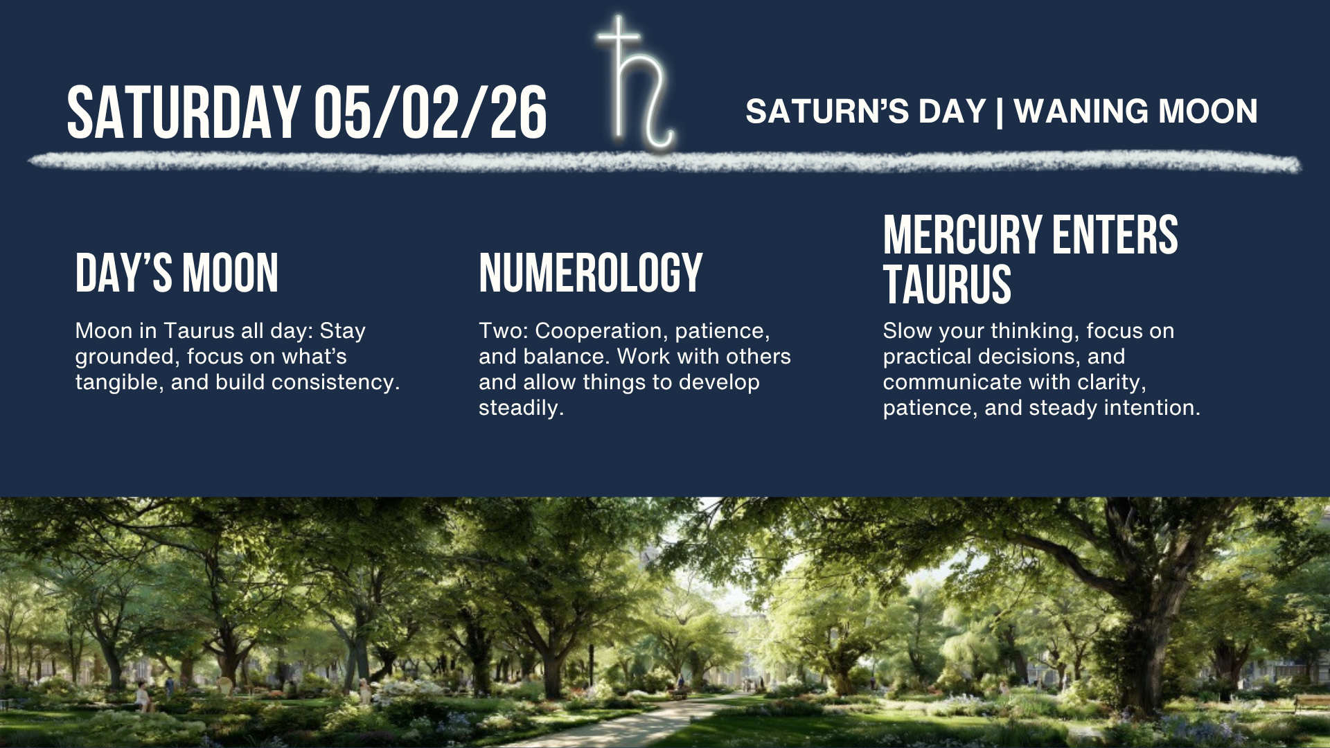 On Saturday, The Moon remains in Scorpio all day, sustaining focus and emotional depth. Mercury enters Taurus, slowing the pace of thinking and supporting more grounded, practical decisions. A 2 day emphasizes cooperation and patience, encouraging a steady and measured approach. Today’s best use: take your time, work with intention, and allow things to develop without pressure.