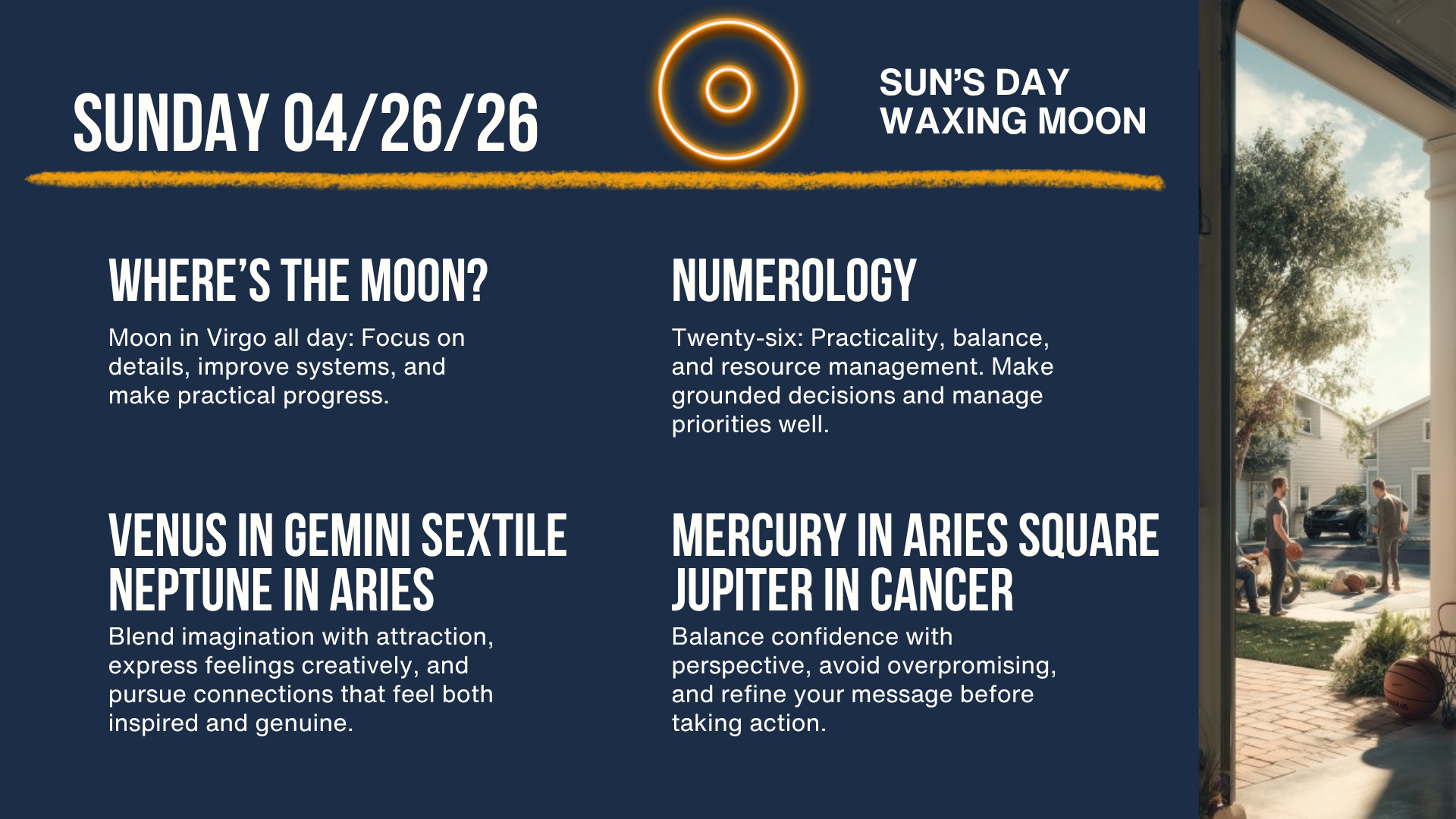 On Sunday, The Moon remains in Virgo all day, supporting organization, refinement, and practical progress. Venus in Gemini sextiles Neptune in Aries encourages inspired connection and creative expression, while Mercury in Aries squares Jupiter in Cancer, making it important to balance confidence with awareness before acting. A 26 day emphasizes practicality and sound decision-making. Today’s best use: focus on what’s workable, refine your approach, and avoid overextending.