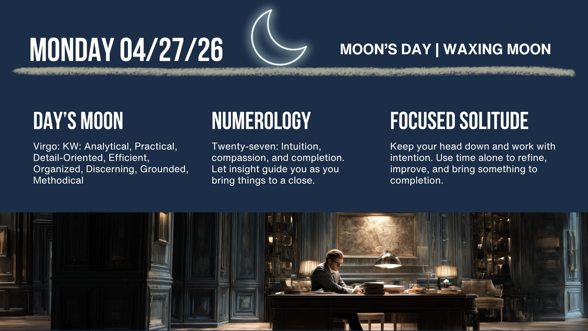 The Moon remains in Virgo all day on Monday, reinforcing focus, discipline, and attention to detail. The energy favors quiet productivity and working independently, especially with a 27 day that supports insight and completion. This is a strong day to stay focused and bring something meaningful to a refined state. Today’s best use: work steadily, keep your head down, and complete what requires precision.