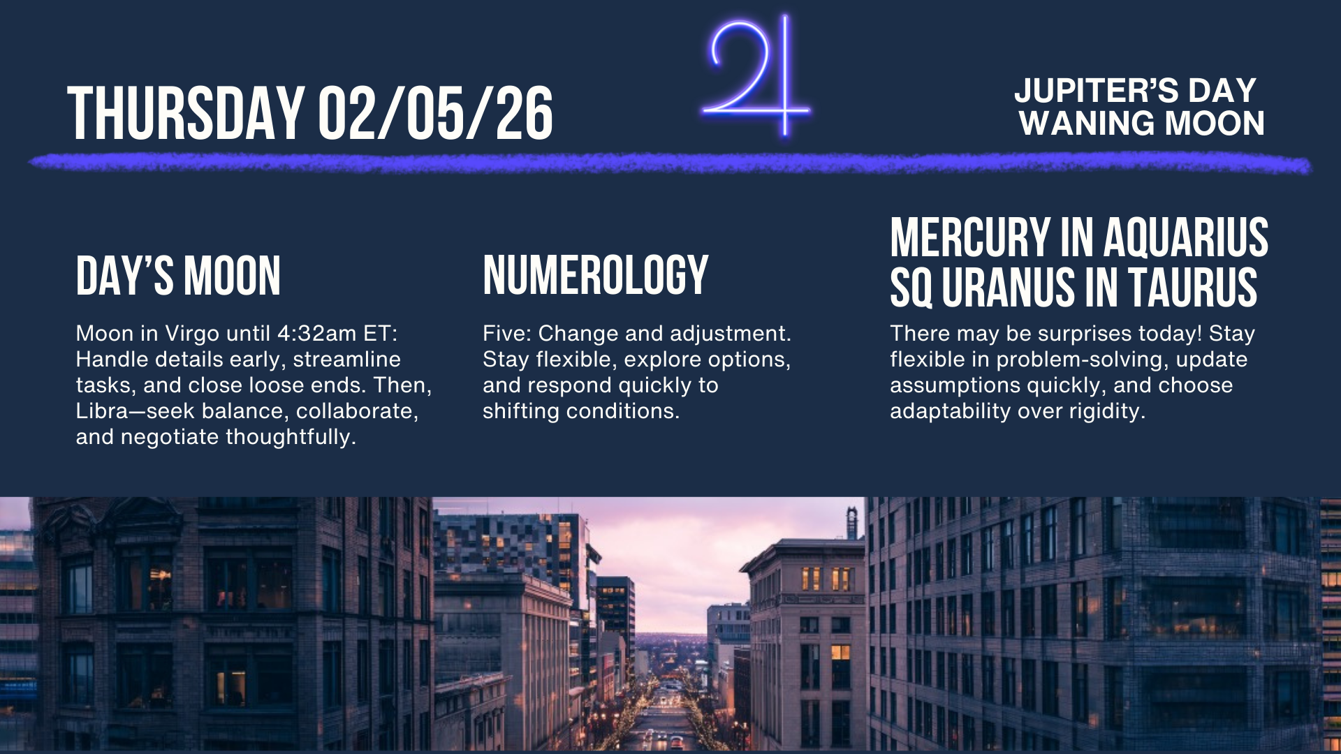 With the Moon in Virgo all day, Tuesday emphasizes practicality, organization, and thoughtful refinement, while Uranus stations direct in Taurus, reactivating stalled changes around work, finances, and long-term security. What’s been uncertain or paused begins to move forward again, but Virgo’s influence favors measured adjustments over sudden leaps. This is a day to update systems, improve processes, and respond intelligently to shifting conditions without overcorrecting. Today’s best use: make practical upgrades, adapt calmly to renewed momentum, and focus on changes that increase stability over time.