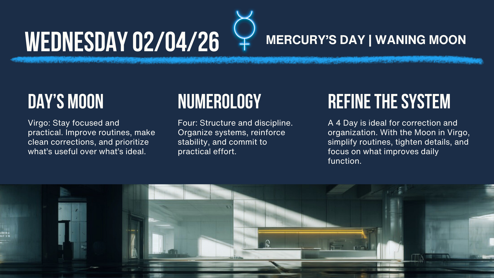 The Moon remains in Virgo all day, reinforcing a focus on organization, efficiency, and thoughtful refinement. This is a highly practical window for cleaning up loose ends, improving workflows, and making small corrections that support long-term effectiveness. With no major aspects pressing the day forward, progress comes through consistency and attention to what’s useful rather than dramatic change. Today’s best use: simplify systems, prioritize what’s functional, and strengthen routines that support daily stability.
