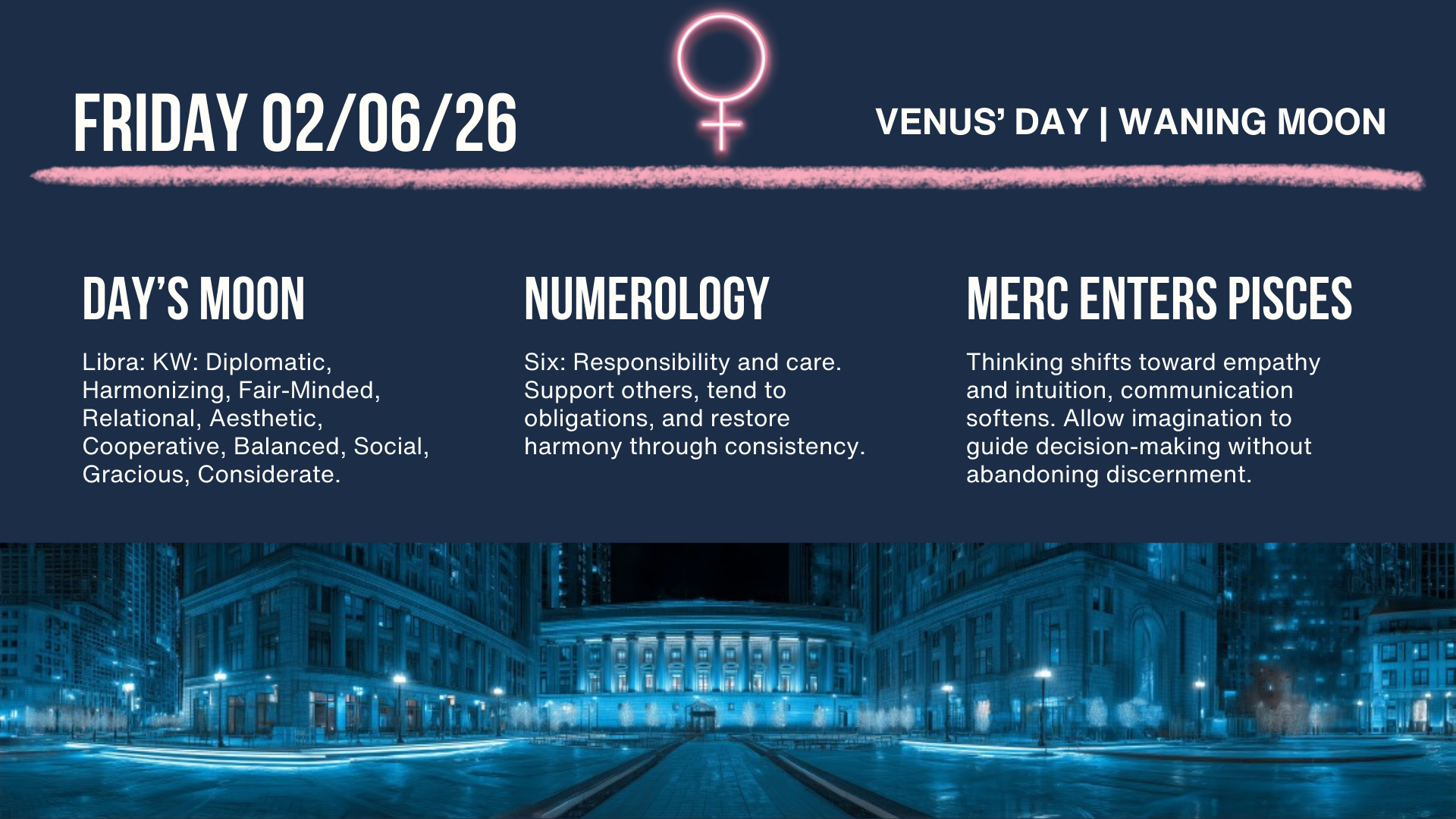 With the Moon in Libra all day, Friday emphasizes balance, diplomacy, and relational awareness. Mercury enters Pisces, beginning an extended stay through April 15 due to its upcoming retrograde, shifting communication toward intuition, sensitivity, and symbolic understanding rather than strict logic. This marks a longer-term change in how information is processed, encouraging listening, empathy, and softer exchanges, while the Libra Moon supports fair-minded dialogue and resolution. Today’s best use: communicate with nuance, prioritize emotional intelligence, and seek harmony without losing clarity.