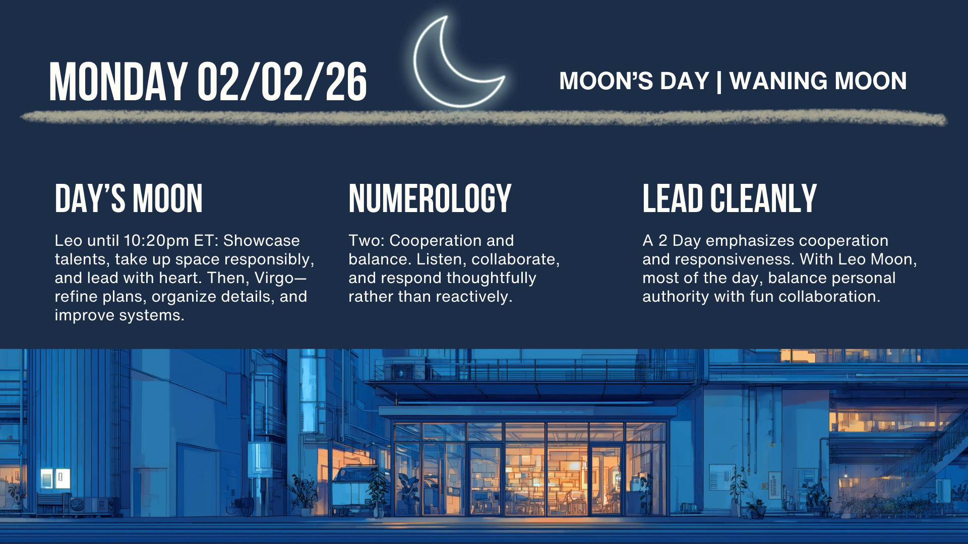 On Monday, the Moon remains in Leo until 10:20 PM ET, keeping the focus on confidence, visibility, and personal authority for most of the day before shifting into Virgo late in the evening. This is a bridge day between expression and refinement, encouraging you to lead with warmth early on and then turn attention toward details and improvement. The shift favors translating recognition or momentum into something more organized and workable. Today’s best use: take the lead earlier in the day, then prepare to refine plans and tighten execution as the energy shifts.