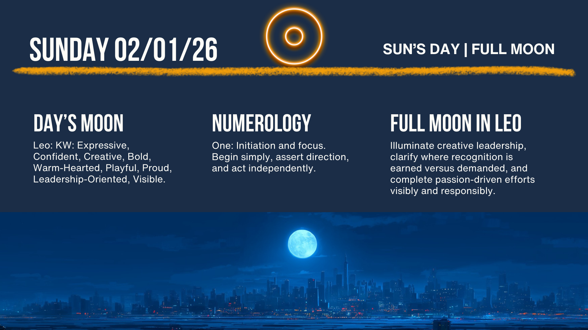 Sunday brings a Full Moon in Leo, amplifying visibility, confidence, and emotional clarity around leadership, creativity, and self-expression. With the Moon in Leo all day, feelings are heightened, but so is the ability to see where you’re ready to be recognized and where effort may be driven more by validation than authenticity. This Full Moon illuminates what’s reached a natural peak and asks for honest acknowledgment rather than performance. Today’s best use: claim genuine accomplishments, express yourself clearly, and release roles or efforts that no longer feel true.