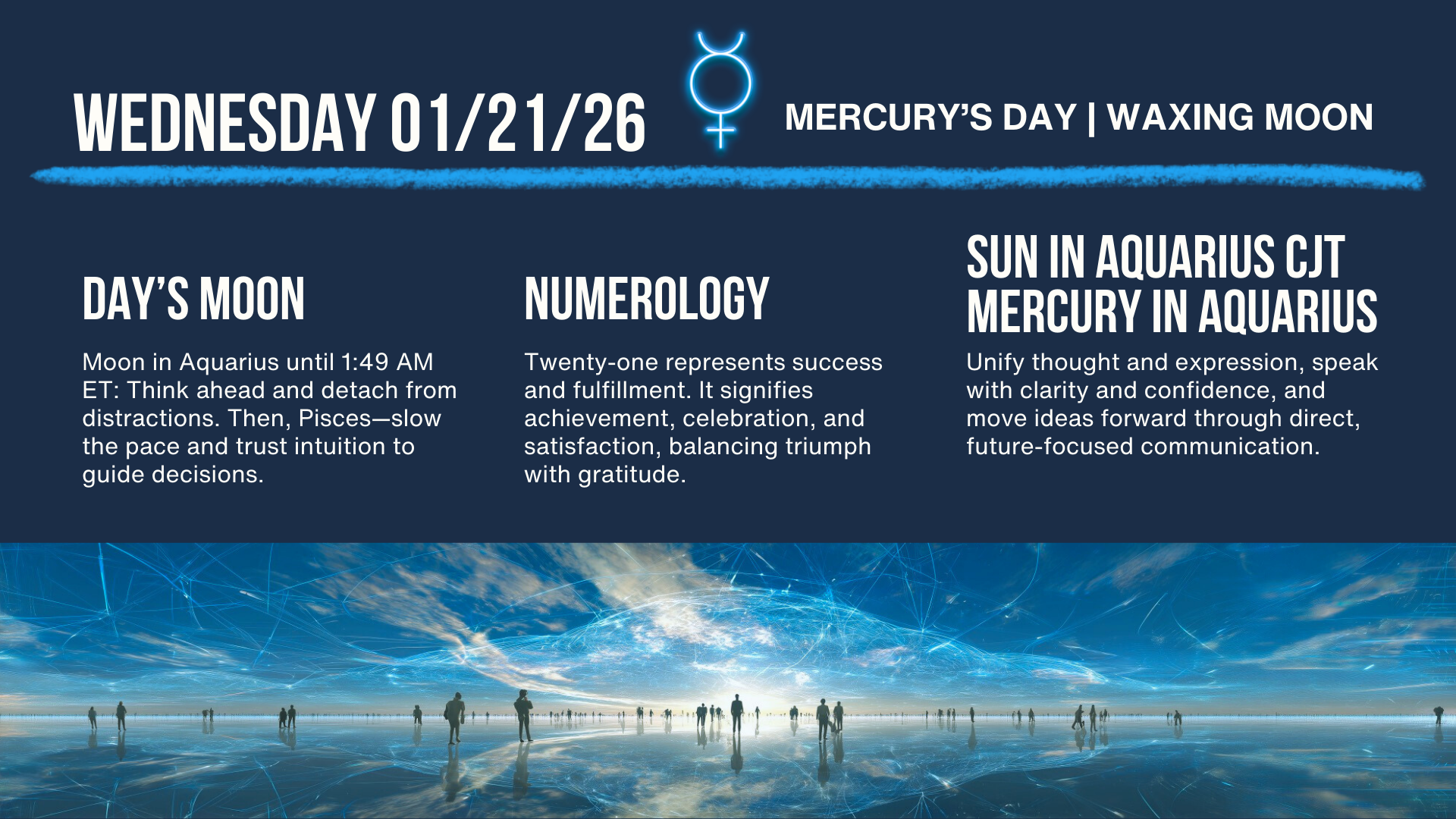 On Wednesday, the Moon enters Pisces at 1:49 AM ET, setting a softer, more intuitive tone for the entire day. The Sun conjunct Mercury in Aquarius supports clear thinking and direct communication, helping you articulate ideas with confidence while staying oriented toward future possibilities. This combination favors expressing insight without overexplaining and allowing understanding to unfold naturally. Today’s best use: communicate clearly, remain receptive, and let intuition guide your next steps.