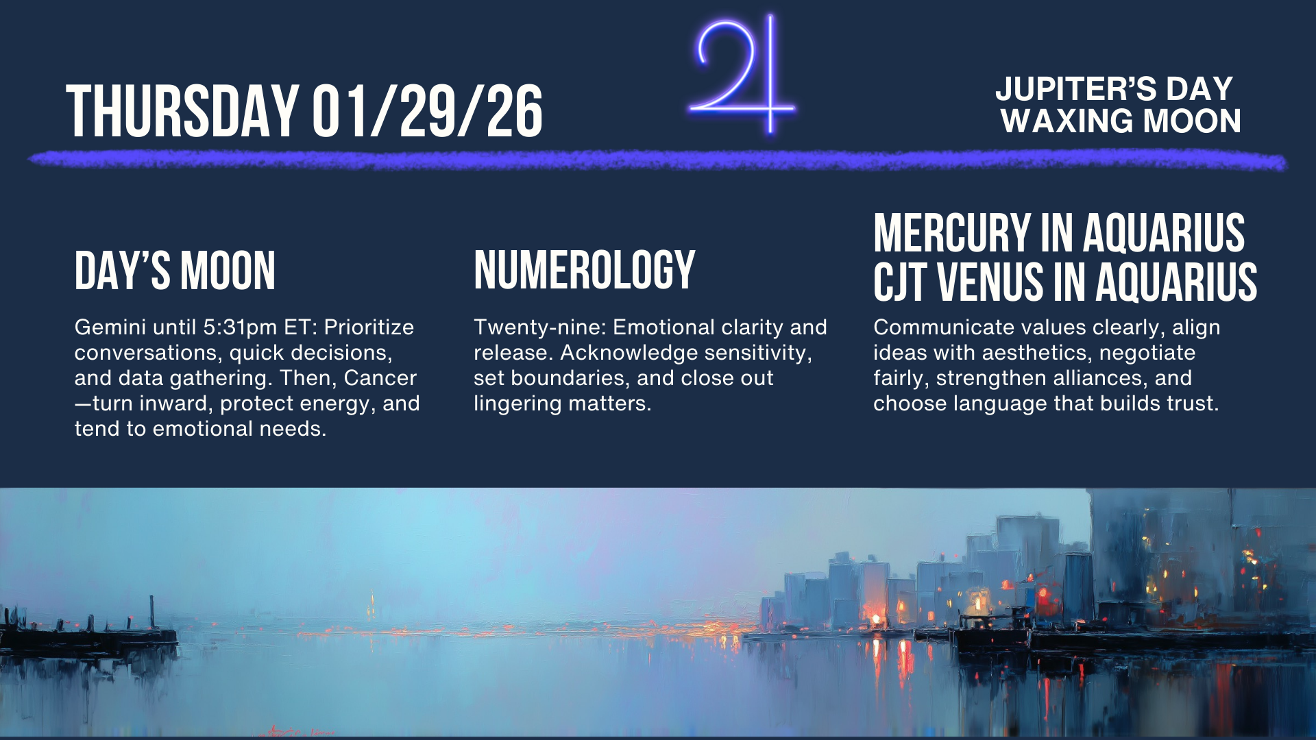 The Moon stays in Gemini until 5:31 PM ET, favoring conversations, quick decisions, and mental organization before entering Cancer in the evening and turning attention inward. Mercury conjunct Venus in Aquarius supports clear, fair-minded communication, especially around shared values, agreements, and collaborations. As the Moon shifts, emotional awareness becomes more important than logic alone. Today’s best use: communicate thoughtfully early, then protect energy and prioritize emotional clarity later.