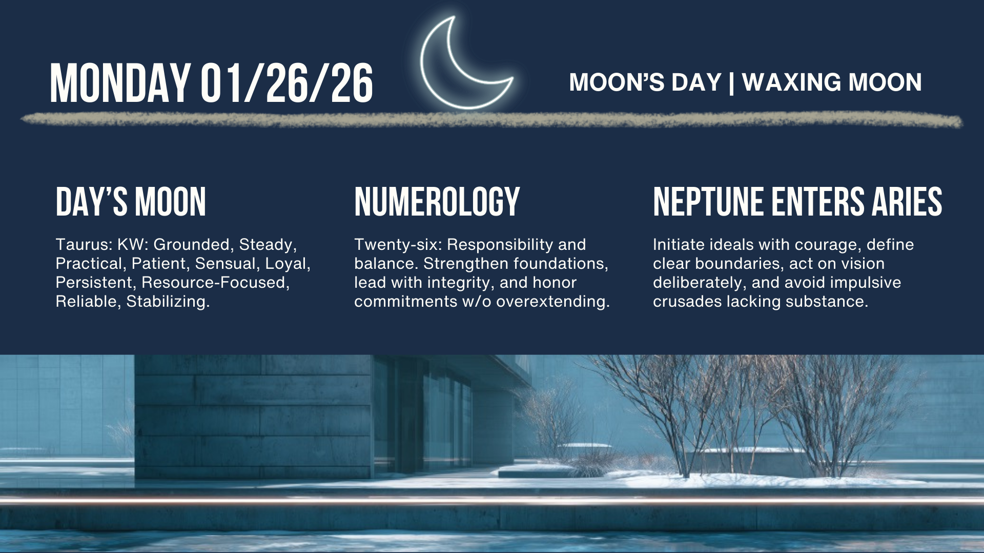 On Monday, the Moon remains in Taurus all day, supporting steadiness, patience, and practical follow-through. More importantly, Neptune enters Aries, beginning a long-term transit that will shape collective direction, ideals, and motivation through March 2039. While this shift unfolds slowly, today asks for conscious grounding: act on inspiration without losing realism, and begin aligning vision with tangible action. The Taurus Moon helps stabilize this transition by emphasizing what’s sustainable rather than symbolic. Today’s best use: ground new inspiration in practical steps, move slowly, and commit only to visions you can actually build.