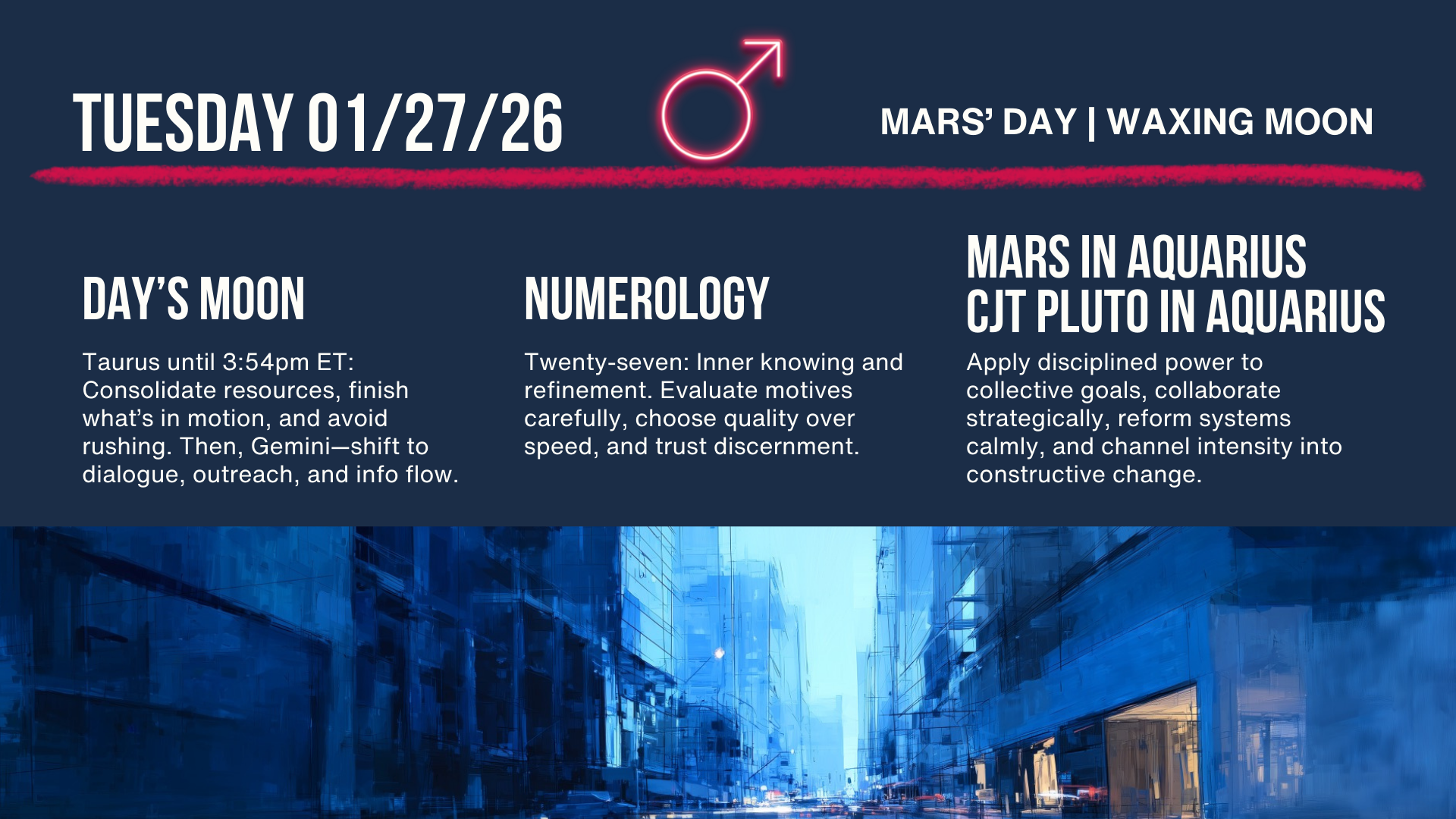 On Tuesday, The Moon remains in Taurus until 3:54 PM ET, keeping the focus on practical matters and follow-through before shifting into Gemini late afternoon and picking up mental speed. Mars conjunct Pluto in Aquarius adds intensity beneath the surface, making this a powerful day for focused effort, strategic action, and system-level change, provided emotions stay regulated. This is not about force, but about applying pressure intelligently and with purpose. Today’s best use: finish something substantial, then pivot toward conversation and coordination without escalating tension.