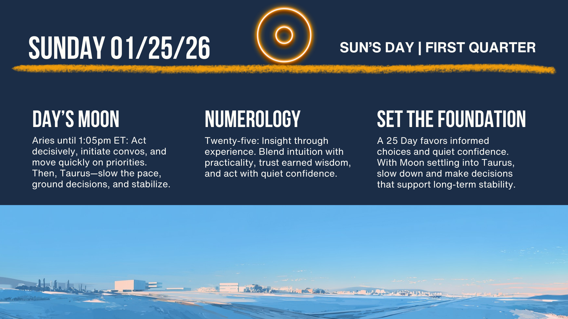 Sunday’s First Quarter Moon emphasizes action and adjustment, asking you to move forward while refining what isn’t working. The Moon stays in Aries until 1:05 PM ET, supporting initiative and clear decisions, then enters Taurus in the afternoon, shifting attention toward stability and follow-through. This is a day to act early, then slow down and secure what’s viable rather than pushing blindly ahead. Today’s best use: take decisive steps, ground your momentum, and commit to what can last.