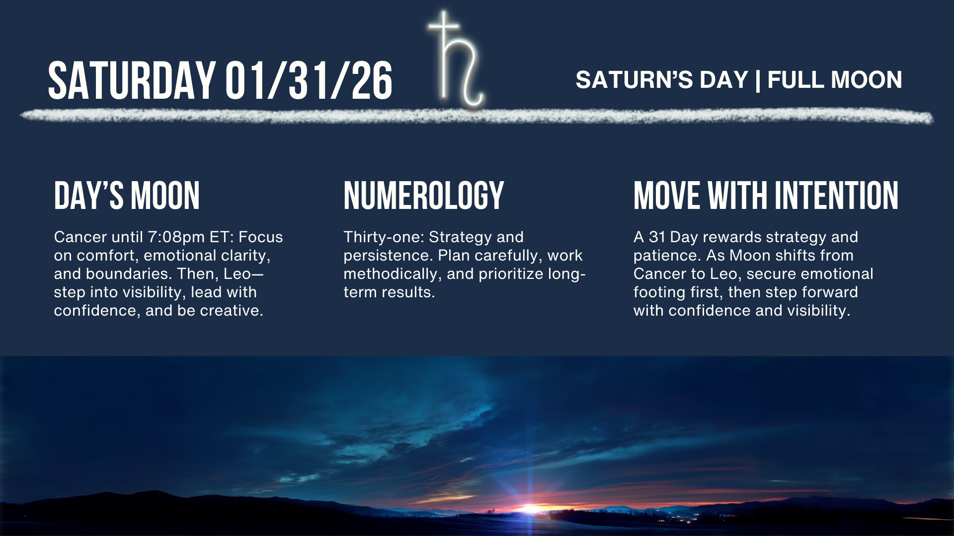 On Saturday, The Moon remains in Cancer until 7:08 PM ET, emphasizing comfort, protection, and emotional grounding before moving into Leo in the evening and shifting attention toward visibility and confidence. A Thirty-one Day favors strategy and patience, making this a day to secure footing first, then step forward deliberately rather than impulsively. Today’s best use: tend to emotional needs early, then move into leadership or creative expression with intention.