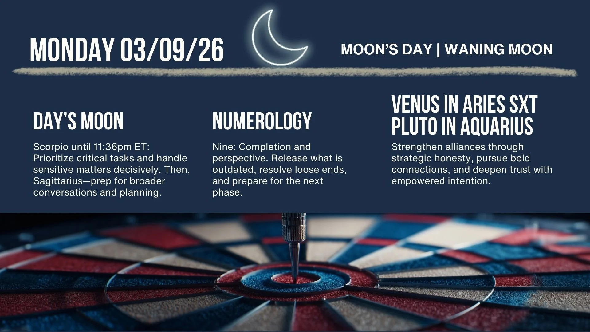 The Moon remains in Scorpio until 11:36pm ET on Monday, keeping attention on priorities, sensitive conversations, and strategic decisions throughout most of the day. Venus in Aries sextile Pluto in Aquarius supports empowered alliances and honest exchanges that strengthen trust. Today’s numerology is Nine, emphasizing closure and perspective before a new phase begins. Today’s best use: finalize decisions, resolve lingering issues, and strengthen key partnerships through direct communication.