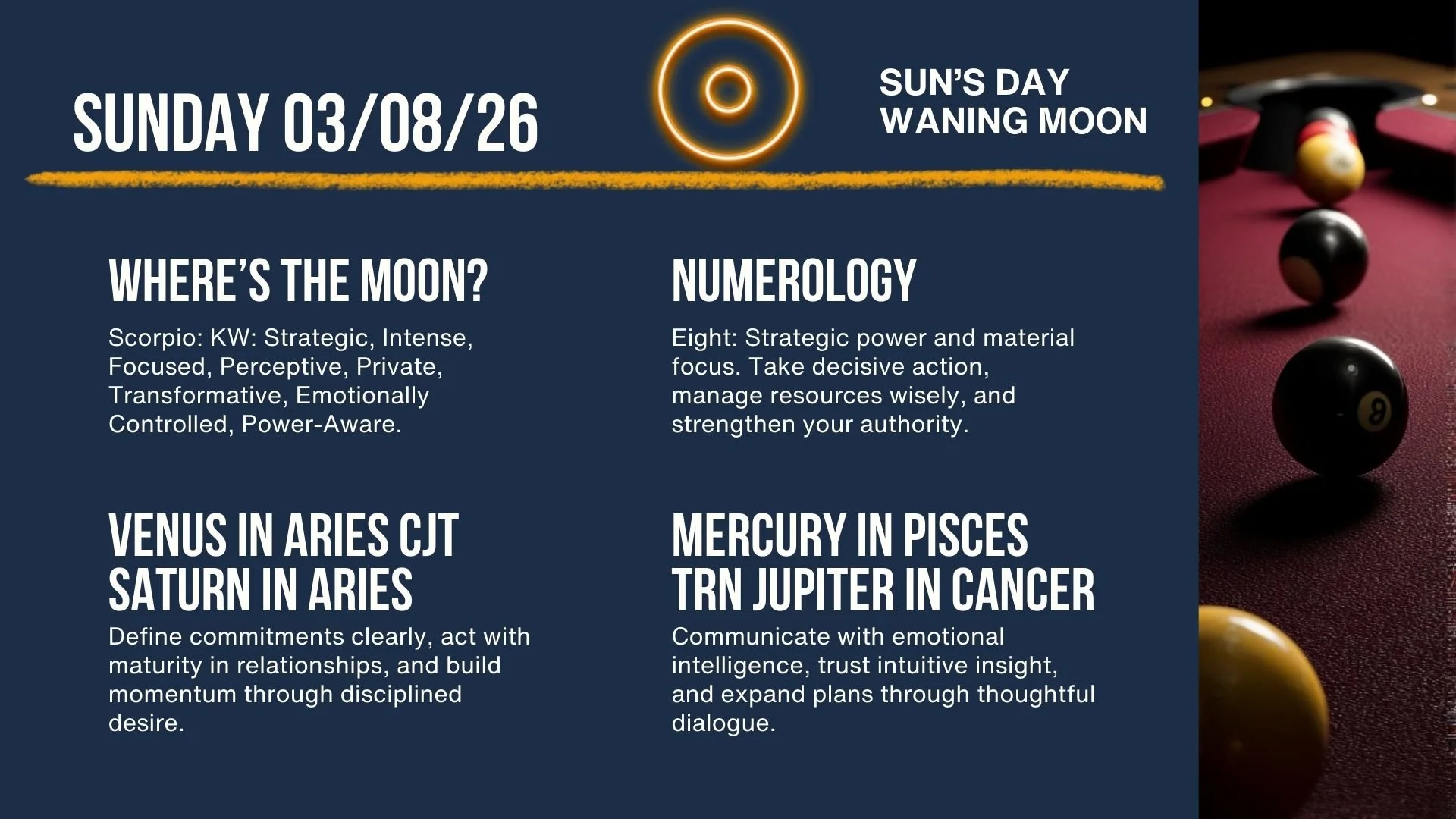 On Sunday, The Moon moves through Scorpio all day, concentrating attention on priorities, power dynamics, and strategic focus. Venus conjunct Saturn in Aries favors mature decisions in relationships and finances, while Mercury in Pisces trine Jupiter in Cancer supports constructive conversations and emotionally intelligent communication. This is a day to move deliberately, strengthening commitments that have real staying power. Today’s best use: handle important matters directly, communicate thoughtfully, and build momentum through disciplined action.