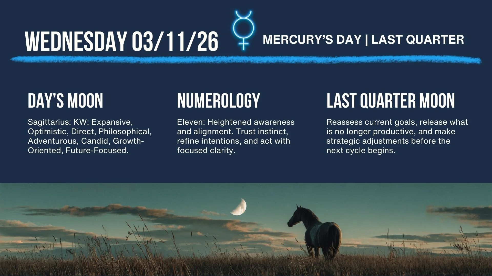 The Moon remains in Sagittarius Wednesday as the Last Quarter Moon invites reassessment and course correction. This phase emphasizes releasing distractions, refining strategy, and focusing attention on what still deserves energy before the next lunar cycle begins. Today’s numerology is Eleven, heightening awareness and encouraging thoughtful alignment between intention and action. Today’s best use: step back, refine priorities, and eliminate what no longer supports forward progress.