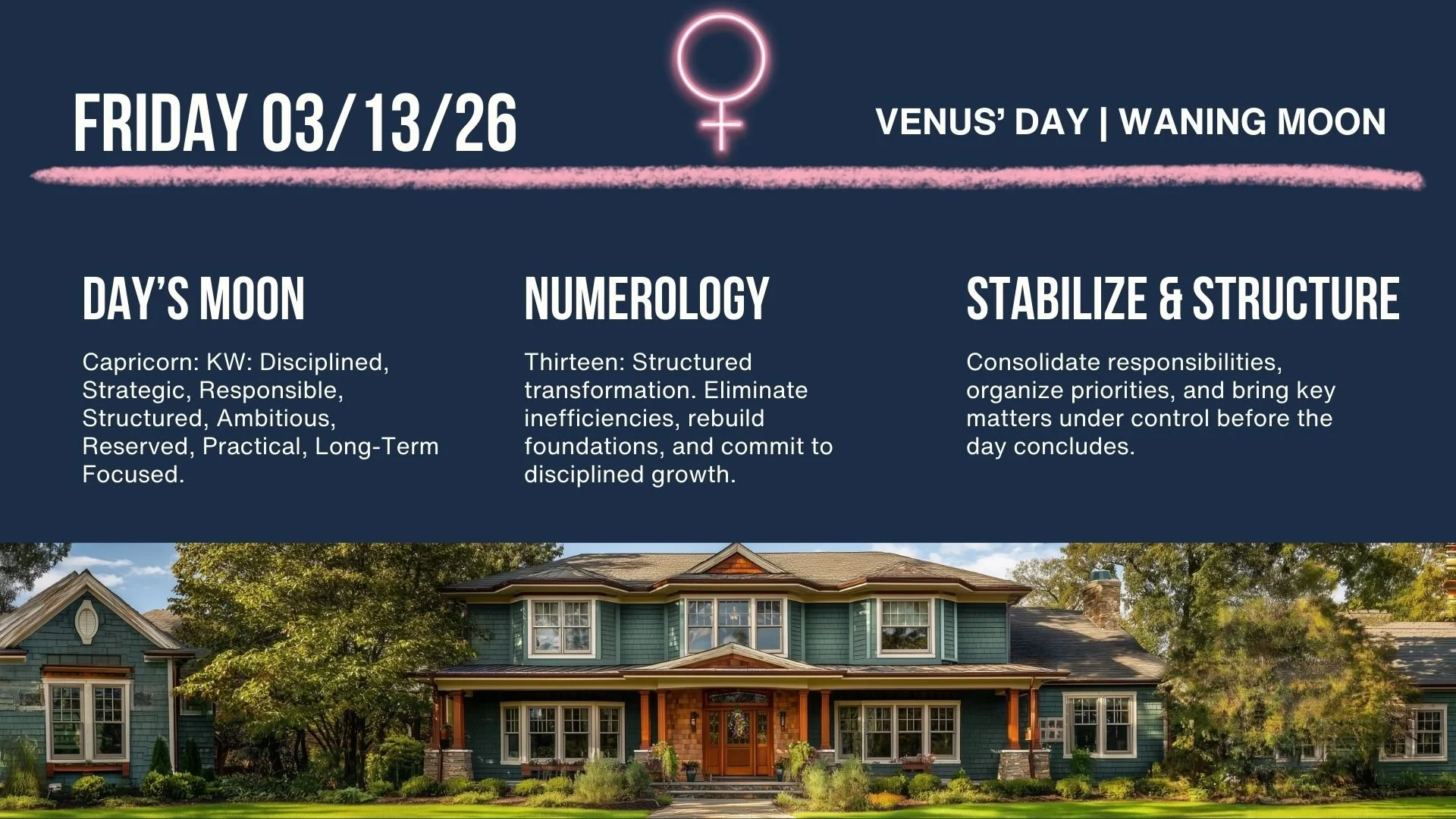 The Moon continues through Capricorn all day Friday, reinforcing structure, accountability, and long-term planning. This steady influence supports stabilizing responsibilities, organizing resources, and bringing important matters under control before the week concludes. Today’s numerology is Thirteen, a number associated with rebuilding foundations and strengthening systems. Today’s best use: finalize plans, organize responsibilities, and create stability through disciplined action.