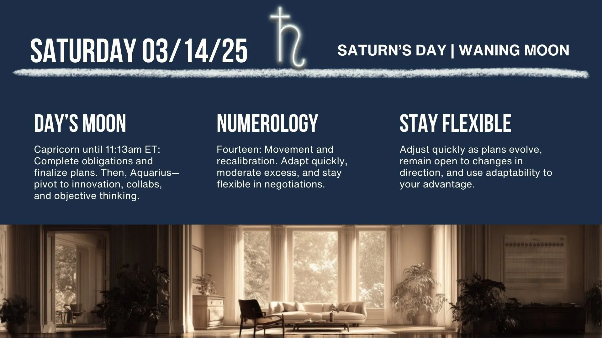 On Saturday, The Moon moves through Capricorn until 11:13am ET, encouraging practical decisions and steady follow-through early in the day. It then shifts into Aquarius, redirecting attention toward new ideas, different perspectives, and unconventional solutions. Today’s numerology is Fourteen, emphasizing adjustment as plans evolve and new information appears. Today’s best use: stay mentally open, reassess strategy if needed, and respond intelligently to changing circumstances.
