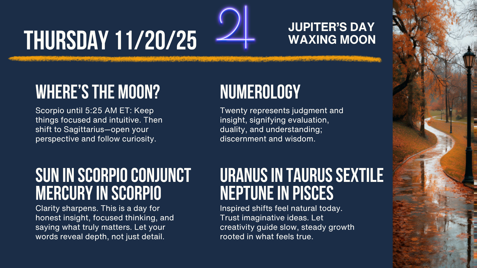 On Thursday, the Moon finishes its time in Scorpio at 5:25 AM ET, helping you start the day with focus and emotional clarity before shifting into Sagittarius, where optimism and discovery take over. The Sun conjuncts Mercury retrograde in Scorpio, sparking meaningful reflections and illuminating wisdom. Meanwhile, Uranus sextiles Neptune, opening subtle doors to inspiration—stay alert for ideas that feel both surprising and divinely timed.