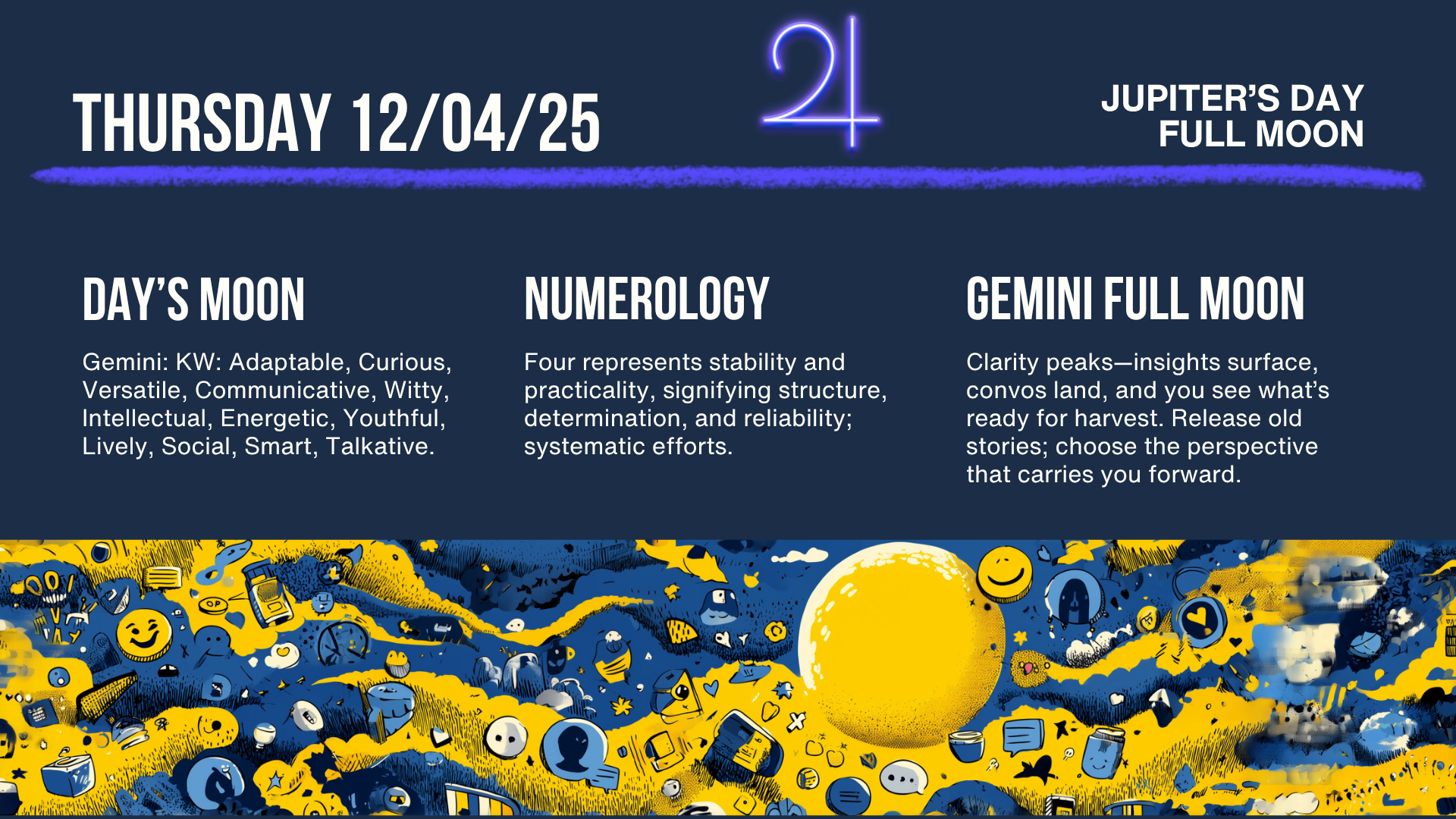 On Thursday, the Moon moves through Gemini all day, bringing movement, conversation, and shifting perspectives. Today’s Full Moon marks a moment of harvest and completion—ideas crystallize, truths surface, and you see what’s ready to be released or carried forward. This lunation features another grand water trine, adding emotional flow, intuition, and ease beneath Gemini’s quick pace. Stay open to insight and let clarity guide your next steps.
